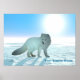 Branco em branco. Uma pintura digital de uma Raposa Árctica, Vulpes lagopus, no gelo polar. O sol pendura baixo no brilhante céu ártico azul. Não olhe para o sol pois pode danificar os seus olhos. Adicione seu próprio texto. A Raposa Árctica é confortável a frio profundo; não começa a arrepiar-se até que as temperaturas caiam para cerca de -70 °C devido à sua pele densa e multicamadas. Outras adaptações a um clima rígido incluem pelo nas solas dos pés, orelhas curtas e um pequeno focinho. As raposas árcticas vivem em tocas, numa nevasca que podem enrolar na neve para criar abrigo. O casaco da raposa do Ártico, por vezes cinzas azuis, é uma camuflagem de inverno muito eficaz. As matizes naturais permitem que o animal se misture no ambiente. Durante a curta estação quente, sua casaco muda para marrom ou cinza, novamente atuando como camuflagem em rochas e plantas tundra. Durante o inverno, quando as presas são escassas, as raposas seguem as ursinhas polares caçadoras que se alimentam de restos. Durante o verão comem roedores, aves, ovos e até peixes. Também se alimentarão de bagas e algas. As raposas árcticas têm uma audição extremamente entusiasmada, auxiliadas pelas suas orelhas largas e viradas para a frente, que lhes permitem localizar a posição exata das suas presas sob a neve. Se ouve algo se movendo sob a neve ele salta para o ar e solta, socando a neve para pegar sua presa. O alcance das raposas do Ártico é circunpolar; elas podem ser encontradas em todo o extremo norte. O único mamífero terrestre nativo da Islândia, chegou caminhando sobre o gelo no mar no final da última era glacial.