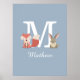 Este poster azul bonito apresenta um filhote de raposa e coelho de coelho da floresta em floresta sentado em ambos os lados do monograma e nome. Projetado por Thisnotme©