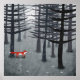 Uma raposa vermelha selvagem se situa entre as árvores de uma floresta escura. Uma pintura paisagística para amantes de animais, natureza e vida selvagem. Arte original de Nic Squirrell.