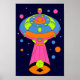 ilustração vibrante e estilizada apresentando um disco voador multi-hierárquico pairando em um ambiente azul escuro. O próprio OVNI é renderizado em tons negros de azul, rosa-quente, verde-neon e laranja, com inúmeras janelas circulares e uma estrutura distinta em cima. Um largo, luminoso, feixe luminoso de luz emana para baixo da base do disco. Suspenso dentro desse feixe está um cubo verde neon, posicionado logo acima de uma forma de diamante laranja esboçada em preto. O fundo é povoado com formas circulares dispersas em várias cores brilhantes, somando-se à atmosfera cósmica e psicodélica. O trabalho de arte tem um estilo gráfico plano com contornos fortes, lembrando ficção científica retrô e pop (desenhada por freepik)