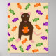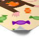 Esta poster apresenta uma imagem gráfica de um rato marrom giro e giro com rabo e pés de orelhas rosa. O rato está segurando uma abóbora laranja entre as patas. Há uma coleção de doces verdes, roxos e laranja ao redor do rato pequeno. Esta design é perfeita para qualquer amante de ratos ou dono deste Halloween.
