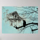 Uma silhueta do pássaro e ramos nus. Pode ser corvo, corvo ou torre. Casa de madeira russa vitoriana abandonada. Você pode alterar a cor do fundo se pressionar o botão "personalizar".