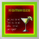 Receita de uma receita de bebida kamikaze. Uma borda amarela e verde limão com um plano de fundo vermelho de estilo verde. Um desenho de um vidro martini com um limão na borda.