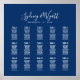 Poster de gráfico de assentos azuis quadrado, marinho com modelos de texto branco. Azul claro e escuro com grandes nomes da noiva e noiva no topo, em um roteiro moderno e manuscrito. A data é impressa abaixo dos nomes. Esta modelo alberga até quinze mesas com oito convidados sentados em cada uma. Personalize conforme necessário para o seu evento excluindo mesas e/ou encurtando listas de nomes. O texto do número da tabela está em um script em negrito, com nomes listados abaixo na fonte impressa. Você pode mudar o tamanho do poster - este é 24 polegadas quadradas.
