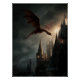 A massive reddish-brown dragon soars with powerful wings spread wide above the towering spires of a dark gothic castle, its silhouette dramatic against a stormy sky pierced by golden light. Swirling mist and ominous clouds add depth and epic tension to this breathtaking fantasy scene. Perfect for fantasy lovers, this striking digital artwork brings medieval grandeur and mythical power to canvas prints, posters, phone cases, mousepads, throw pillows, tapestries, and décor that transforms any space into a legendary realm.