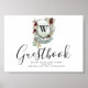 Dê seu nome casado e inicial nesta elegante crista floral vermelho burgundy. Sua inicial está escrita na crista e seu sobrenome casado está na faixa. Está rodeada por flores vermelhas e brancas de marfim. Guestbook é escrito em uma fonte moderna de script de quadril. Seu sentimento está escrito em uma fonte clássica de serifa.