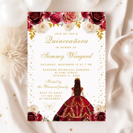 Esta elegante e glamourosa placa de boas-vindas da festa de aniversário Quinceañera apresenta uma bela princesa com cabelo escuro em um vestido de tiara e bola vermelha. O texto combina o script manuscrito e as fontes sans serif modernas para um aspecto elegante e sofisticado. Os arranjos florais, borboletas e confete de ouro criam a mistura perfeita de rústicos e quicos. Gráficos por www.etsy.com/uk/shop/SunflowerDayLove