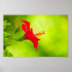 The delicate, elongated petals and striking yellow stamen are highlighted in a deep red hue, symbolizing tropical beauty and passion. A tight bud rests beneath the open bloom, promising more splendor. This picture evokes the warmth of summer and the lush, vibrant life of a tropical garden.