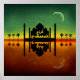 Eid Mubarak saudando a ilustração: uma mesquita e uma silhueta de palmas em um fundo noturno com a lua e estrelas refletindo sobre a água.