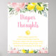 Este adorável jogo de pensamentos Fraldas é uma maneira excelente de se divertir com seu Chá de fraldas e é garantido que seja um grande sucesso! Basta mostrar este sinal bonito junto com uma pilha de marcadores fralda e Sharpie. Cada convidado escreverá uma mensagem na fralda, pode ser algo engraçado ou palavras de conselho para os pais lerem enquanto mudam a fralda do bebê. O design apresenta limões coloridos de aquarelas, flores cor-de-rosa e confete de folha de ouro falso.