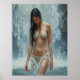 A vibrant artwork depicting a young woman standing beneath a refreshing waterfall, with sprays swirling around her in a lively summer scene that blends the beauty of nature with a spirit of adventure.