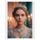 Um retrato hiperdetalhado de uma mulher com pele sem defeitos e um olhar intenso e cativante. Ela é coroada com uma tiara prateada adornada com quartzo rosa e opais brancos, complementados por brincos cor-de-rosa e um colar prateado ornamentado em camadas. O seu rosa pálido brilha sob o ciano suave e a luz laranja quente. O fundo apresenta um interior luxuoso, amolecido com o feixe de luz de velas, criando uma atmosfera elegante e refinada.