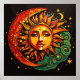 Um rosto de sol cercado pela lua e estrelas no espaço com cores vermelhas, douradas, verdes reggae