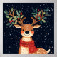 Uma rena feliz enfeitada com bagas sagradas e conterrâneo em suas galhadas, colocada contra um céu azul mágico e noturno cheio de estrelas.