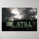 Fique quieto e saiba que sou poster de Deus com a foto da luz do sol brilhando através do nevoeiro enquadrada por árvores.