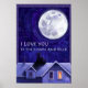 O design do Relógio da Lua Eu Te Amo Até a Lua e Volta apresenta nossa arte original criada por nossa talentosa ilustradora infantil, Traci Van Wagoner, de um pai, filho e cachorro no telhado de sua casa assistindo à lua cheia nascer no céu noturno com as palavras, Eu Te Amo Até a Lua e Volta. Envie hoje mesmo para alguém que você ama um belo lembrete.