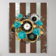Relógio antigo e patenteado, adornado com joias, mãos de ouro e algarismos latinos com rosa de turquesa sobre fundo castanho e listrado. Estilo Steampunk.