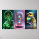 Um trio de renderizadores digitais vibrantes retrata conceitos futuristas com elementos brilhantes. À esquerda, uma ciborgue fêmea com padrões luminosos de circuito verde olha para frente, no centro, uma máquina detalhada com esferas está envolta em uma cúpula de vidro, e à direita, uma ave metálica com destaques coloridos fica poçada.