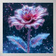 A imagem mostra uma representação artística de uma flor que parece ser feita de materiais vibrantes e brilhantes. As pétalas são uma mistura de matizes rosas e roxas, misturadas com um acabamento metálico e embelezadas com pequenas gotículas de água que melhoram sua delicada aparência. O centro da flor apresenta detalhes complexos, incluindo tons vermelhos e fuchsia, criando um contraste impressionante. Ao lado da flor emergem duas folhas, exibindo uma qualidade brilhante semelhante com tons de azul e prata. Esses elementos são ainda acentuados por um fundo cinza e cintilante que adiciona à composição uma atmosfera mágica e sonhadora, fazer a flor se destacar como ponto focal.