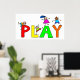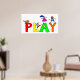 Ótima ilustração cartoon de meninos e meninas escalando em letras gigantes do alfabeto que soletra a palavra PLAY. Imagem disponível em vários presentes e produtos. Posters. Impressões.