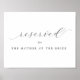 Um sinal de casamento minimalista com "reservado" em letra de escrita de caligrafia negra e "a mãe da noiva" em letra serif.