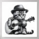 Retrato realista a lápis de uma cinza de gatinho vestindo camisa, gravata de arco e um chapéu tocando violão acústico.
