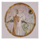 Uma pintura digital de um Smew em um vestido cor-de-rosa com colares de rendas. Há uma cadeira com um vestido branco e um chapéu repousando nela. Um retrato antigo de uma cabeça de pato numa armação de madeira redonda e marrom-escura, pendura na parede. A parede é papel de parede rosa com aves tropicais. A trabalho de arte é colocada em dentro de uma moldura decorativa redonda esculpida que tem algumas flores entalhadas nela. Copyright ©2017 Kimberly J Tilley.