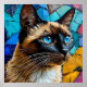 Uma representação artística cativante de um gato siamês, apresentando olhos azuis impressionantes contra um fundo abstrato dinâmico e colorido. Perfeito para temas de animais de estimação, criatividade e expressão artística.