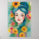 Este design vibrante e caprichoso apresenta um retrato abstrato de uma mulher com cabelo azul lacrimejado com flores coloridas. Sua expressão serena é acentuada por olhos fechados e lábios vermelhos, dando a ela uma aparência de sonho. Ao redor dela estão girassóis vibrantes, flores cor-de-rosa, e uma variedade de folhagem verde, criando uma atmosfera exuberante, semelhante a jardim. A peça tem um estilo de interface suave e vetorial, dando-lhe um sentimento moderno, mas romântico. A paleta de cores é dominada por chaleiras, amarelos, pinças e verdes, criando uma composição harmoniosa e atraente para os olhos.
