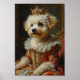 Um elegante retrato real apresentando o charmoso Bichon Frise retratado como uma rainha francesa. Inspirado em pinturas a óleo clássicas europeias, o design destaca a pelagem branca fofa da raça e a personalidade alegre com trajes reais luxuosos e uma coroa de joias.