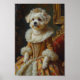 Um elegante retrato real apresentando o Coton de Tulear retratado como uma graciosa princesa da ilha. Inspirado em pinturas a óleo clássicas europeias, o design destaca o pelo macio e fofinho da raça com trajes reais luxuosos e uma delicada tiara de joias.