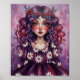 Cartaz caprichoso com um retrato de uma menina de olhos arregalados com cachos roxos em cascata, uma coroa de frutas silvestres e flores, bochechas rosadas e um vestido com padrão de margaridas em um fundo cor de mauve. Finalizado em um estilo pictórico de impasto de acrílico a óleo.