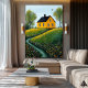 Fuja para um mundo de calor e serenidade com esta encantadora ilustração do estilo Naïf. Uma pequena cabana amarela se senta sobre colinas verdes rolantes, cercada por flores silvestres e um caminho de campo sinuoso que leva a uma casa pacífica. As pinceladas suaves e cores vibrantes criam uma atmosfera nostálgica e convidativa, perfeita para amantes da arte popular, paisagens rurais e confortável decoração doméstica.