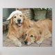 Esta design apresenta uma fotografia de dois cães que se recuperam do ouro do lado de fora de um pátio. Um está sorrindo e vestindo um boné branco de beisebol, enquanto o outro relaxa!