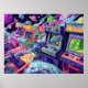 Retro arcade machines are nestled among vibrant planets and stars. The scene combines nostalgia with a colorful cosmic theme.
