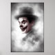 • A vintage-styled clown strikes a sinister pose in a foggy photo studio.