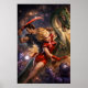 This is an original graphic derived from a vintage 1940's science fiction fantasy magazine cover featuring a couple riding on an alien dragon like creature in space while being chased by robots.