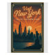 Poster de viagens retrô da linha do horizonte de Nova Iorque no pôr do sol, visto do outro lado do rio Hudson. Marcos ícones como o Empire State Building