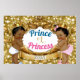 Príncipe Africano ou Princesa Glitter Gênero Revela Poster Príncipe Africano vestindo uma coroa de ouro e fralda branca com chinelos azuis ao lado de uma bela princesa Africana vestindo uma fralda roxa e roxa, com pantufas de coroa dourada e coelheiros cor-de-rosa sobre uma elegante armação de ouro sobre um fundo brilhante. Personalizar Texto do Banner) © 2018 Miss Design do Partido Sassy
