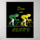 The black background highlights the drama of world-class stage races. The typography of “Ride For Glory” is bold and forward-thrusting, mimicking the motion of a breakaway sprint, while artistic flourishes like dust trails and glowing sunlight convey the intensity and prestige of competition. This artwork is ideal for cycling enthusiasts, racing event posters, or motivational sports decor, embodying both the raw power of elite racing and the rich symbolism of the yellow and green jerseys. It’s more than just art — it’s a celebration of courage, strategy, and the pursuit of greatness in the world’s most legendary cycling arenas.