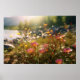 Rio com Flores Rosa e Amarelo no Primeiro Plano Esta imagem mostra um rio fluindo através de uma paisagem montanhosa com flores rosa crescendo ao longo de suas margens. As montanhas estão em segundo plano, fornecendo um incrível pano de fundo para a cena. As flores cor-de-rosa no primeiro plano adicionam um pop de cor e beleza à imagem.