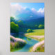 Na trabalho de arte digital, o telespectador é apresentado com uma cena serena de um rio tranquilo fluindo por um campo verde-luxuoso. O rio é flanqueado em ambos os lados por lindas flores cor-de-rosa, acrescentando um pop de cor à paisagem, que de outra forma seria verde. À distância, pode-se ver um aglomerado de árvores verdes, seus ramos balançando suavemente na brisa. À medida que os olhos caminham em direção ao horizonte, pode-se discernir a visão de montanhas envoltas em nuvens, acrescentando à composição um sentido de profundidade e distância.