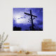 A Cruz de Jesus vazia coberta de vinhas durante um pôr do sol da noite. Este é um impressão de dois tons em tons de roxo.