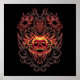 Uma figura demoníaca, envolta na escuridão e adornada com chifres e traços esqueletais, apresenta um ritual. As mãos da figura estão esticadas em direção a um crânio brilhante que repousa sobre um pedestal, cercado por chamas e fumaça giratória.