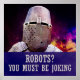 Vista aproximada de um capacete e de uma armadura de pratos de um cavaleiro medieval contra o fundo colorido que imita o espaço exterior ou um campo de batalha ao seu gosto. Texto - Robôs? Você deve estar brincando - adicionado