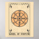 Roda de Tarot em Distância sobre fundo bege claro, com uma roda de ruína antiga rodeada por ervas e folhas secas. Um cheio de cartomância único de simbologia para ter uma visão do passado, presente e futuro, perfeito para autorreflexão, meditação e paz interior.