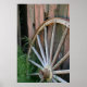 Uma velha roda de vagão fica ao lado de um celeiro de meteoros com um toque de grama verde para cor.