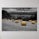 Uma fotografia tirada de alguns fardos de feno aparentemente indo em direção à fazenda a distância.