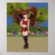 Darby the Roller Derby Fairy é uma fábrica de mangá shoujo e ela está vestindo um topo vermelho e saia com corações em suas almofadas de joelho, diamantes vermelhos e negros em suas meias, e chamas em suas skates. Ela tem asas negras e vermelhas e caudas grandes de porco. Ela está patinando perto da floresta, passando pelos lindamente coloridos cogumelos. Ilustração da KLeighE da Hinterland Harmony Art e Illustrations.