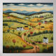 Um design com uma comunidade rural sobre colinas rolantes feitas no estilo americano de arte popular